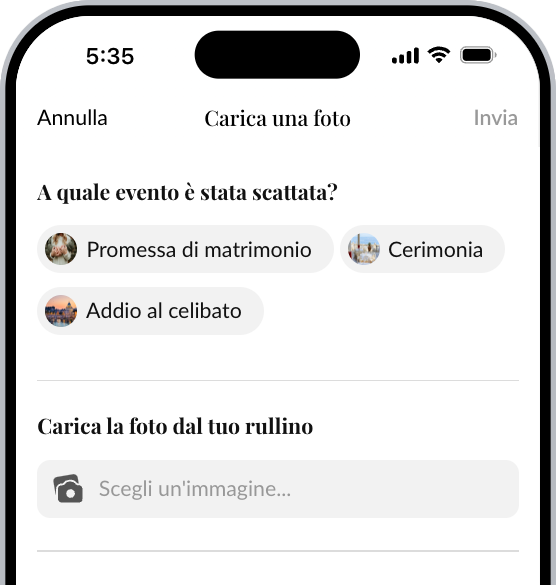 Offri agli ospiti la possibilità di vivere il tuo matrimonio in tempo reale, grazie alla condivisione rapida e immediata delle foto.